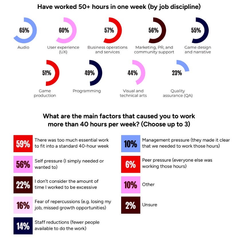The state of work in the game industry remains challenging, with half of game workers reporting that they put in 50 or more hours a week, and a whopping 21 percent saying they worked 60 hours or more in a single week over the past year.
