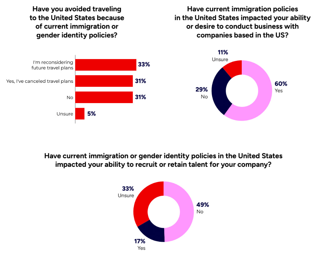 About 60 percent of non-US industry leaders and investors said current immigration policies have impacted their ability or desire to do business with American companies. While 18 percent of those at companies with at least 20 employees said that immigration and gender identity policies have impacted their ability to recruit or retain talent. That goes up to 21 percent when asking people who work at companies with at least 100 employees.